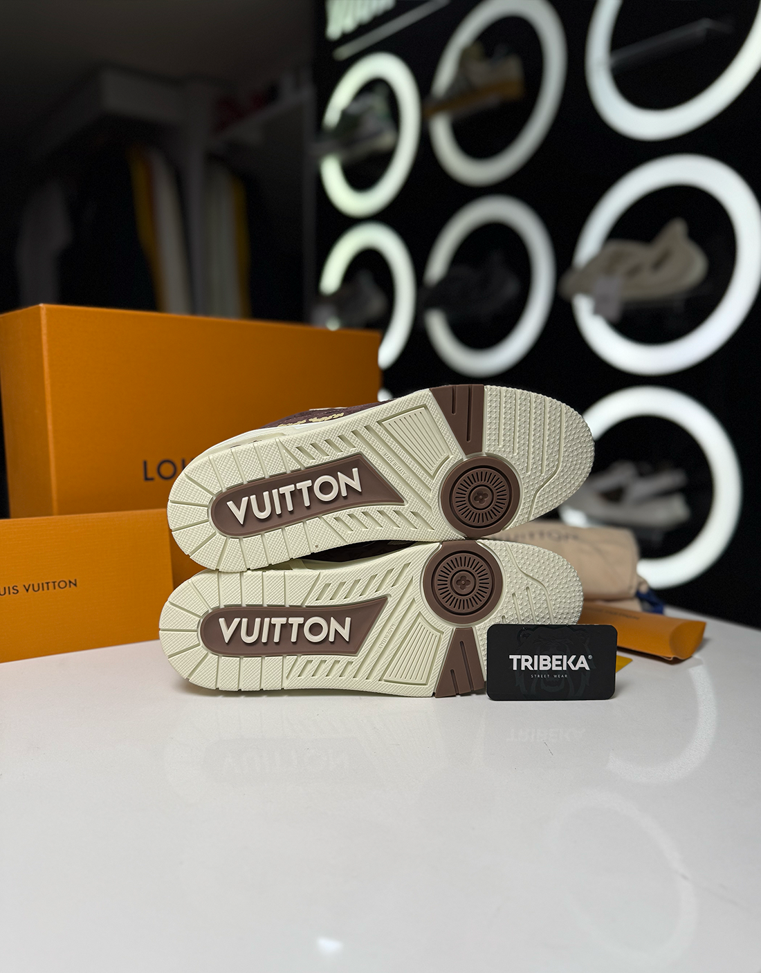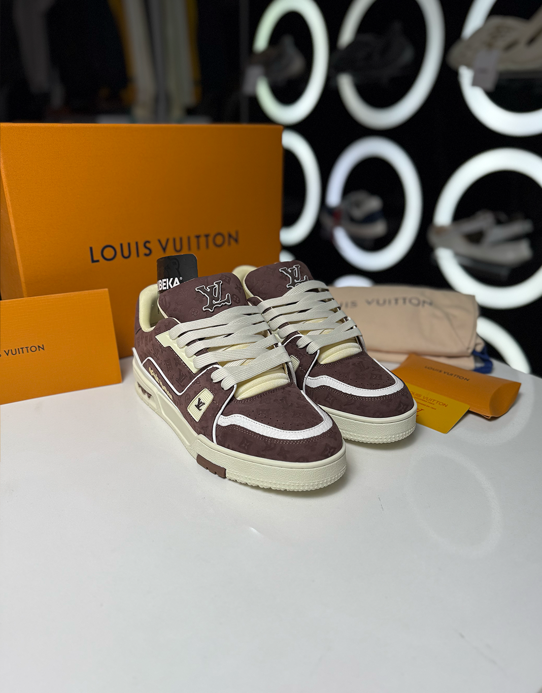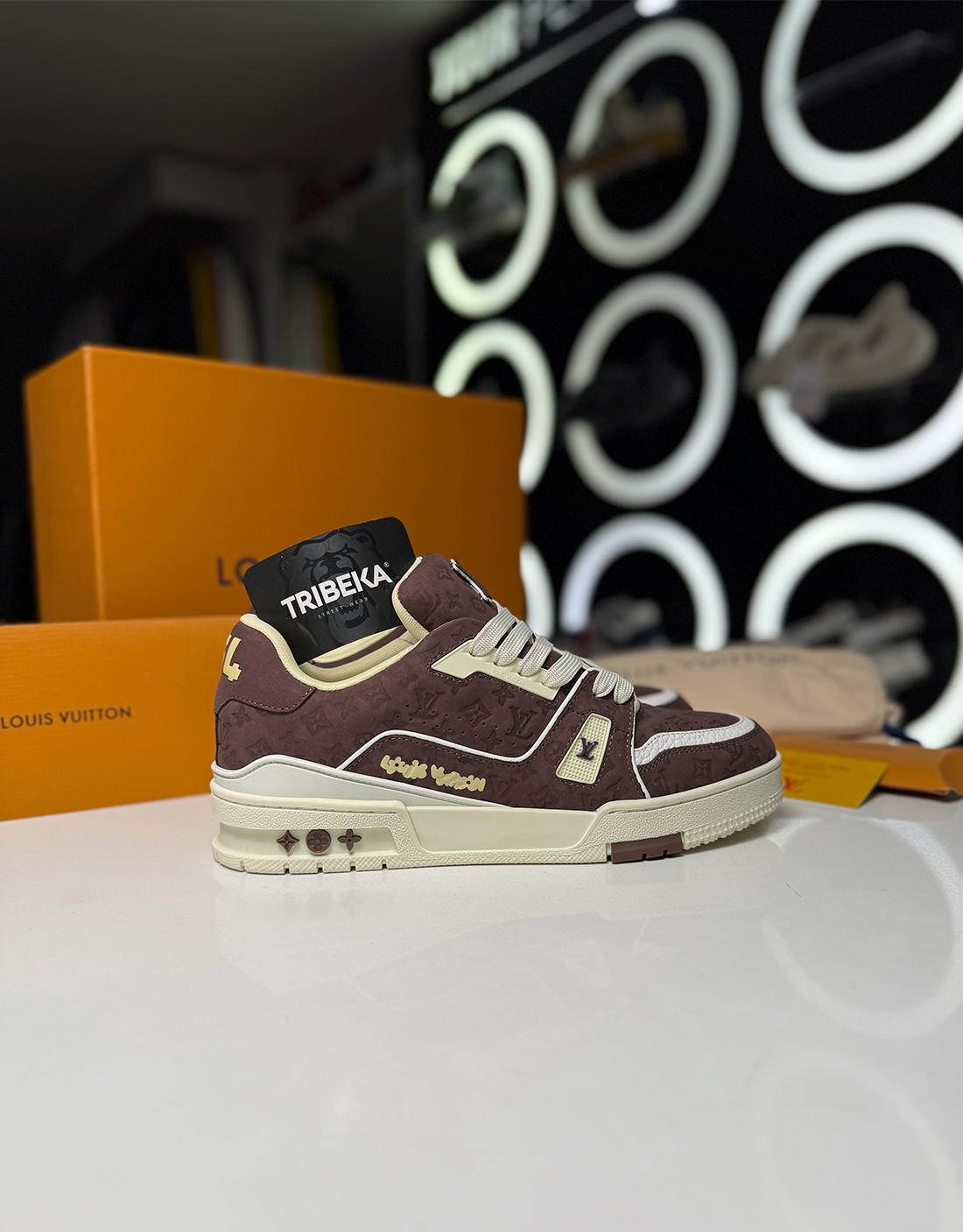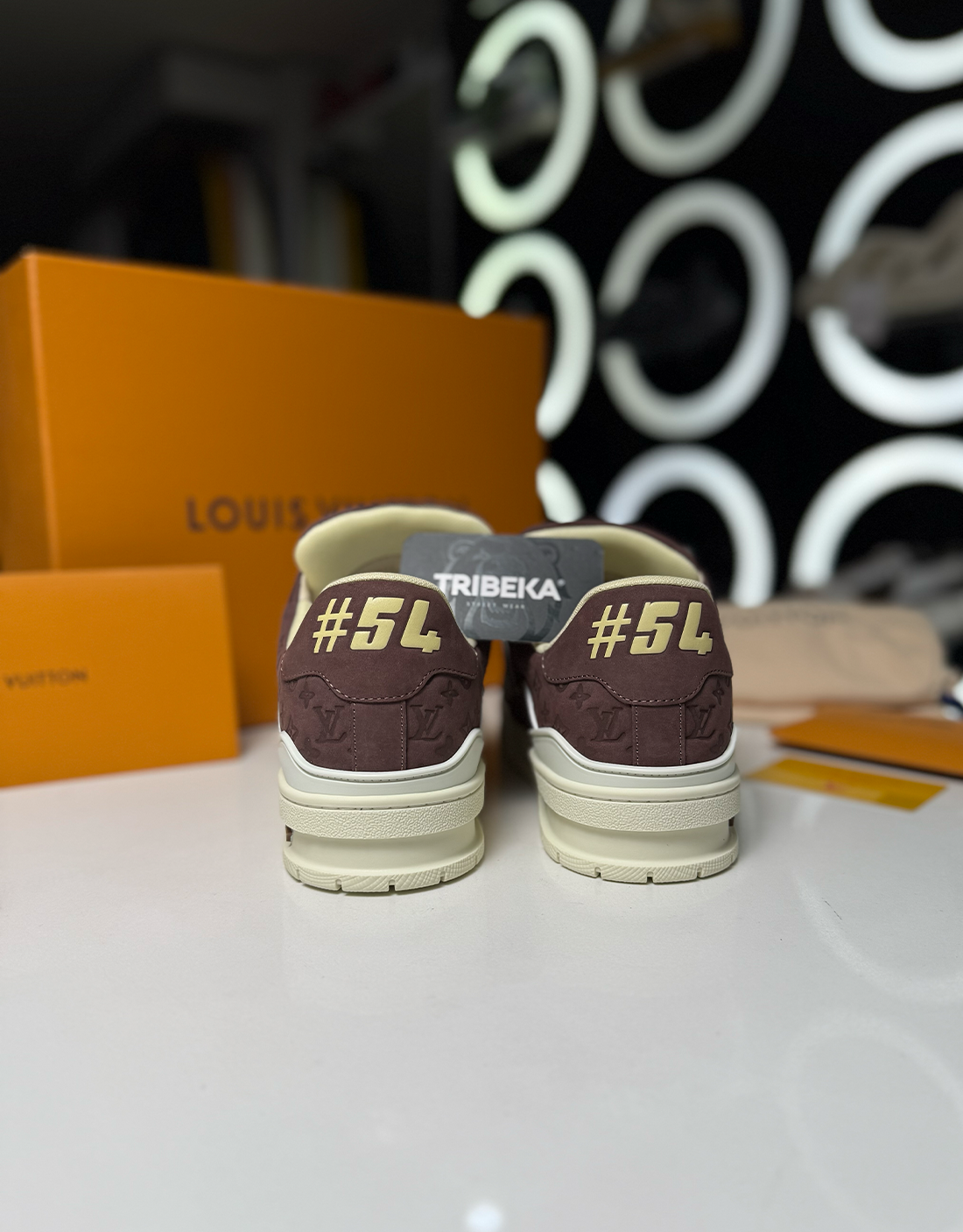 La zapatilla LV Trainer se reinterpreta en piel de becerro granulada con toques de color. Este icónico modelo, diseñado por Virgil Abloh, se inspiró en las zapatillas de baloncesto clásicas y presenta una parte superior elaborada. Los detalles clave son la firma Louis Vuitton en el lateral y la firma Vuitton con fuente de estilo western en la parte trasera.