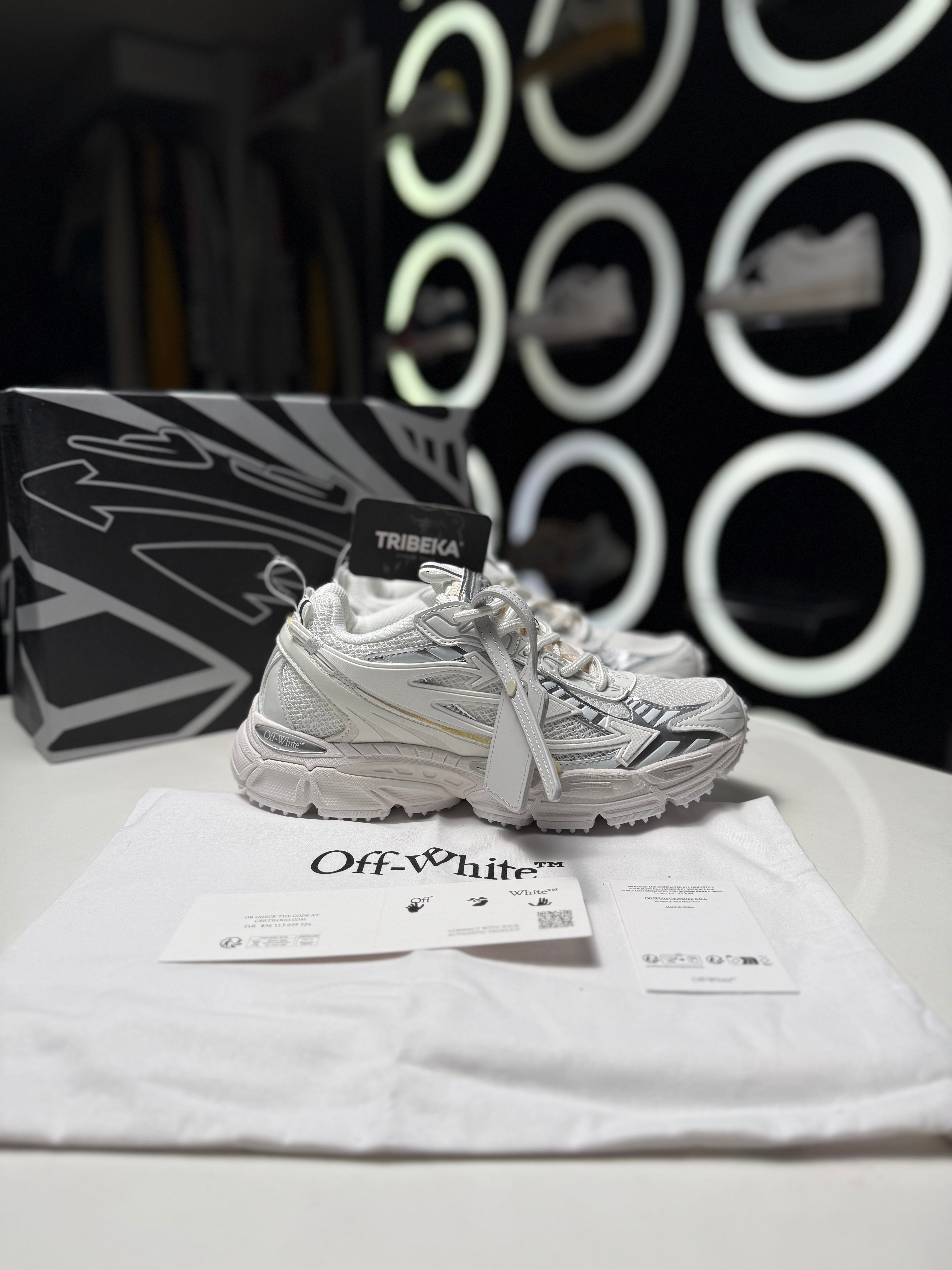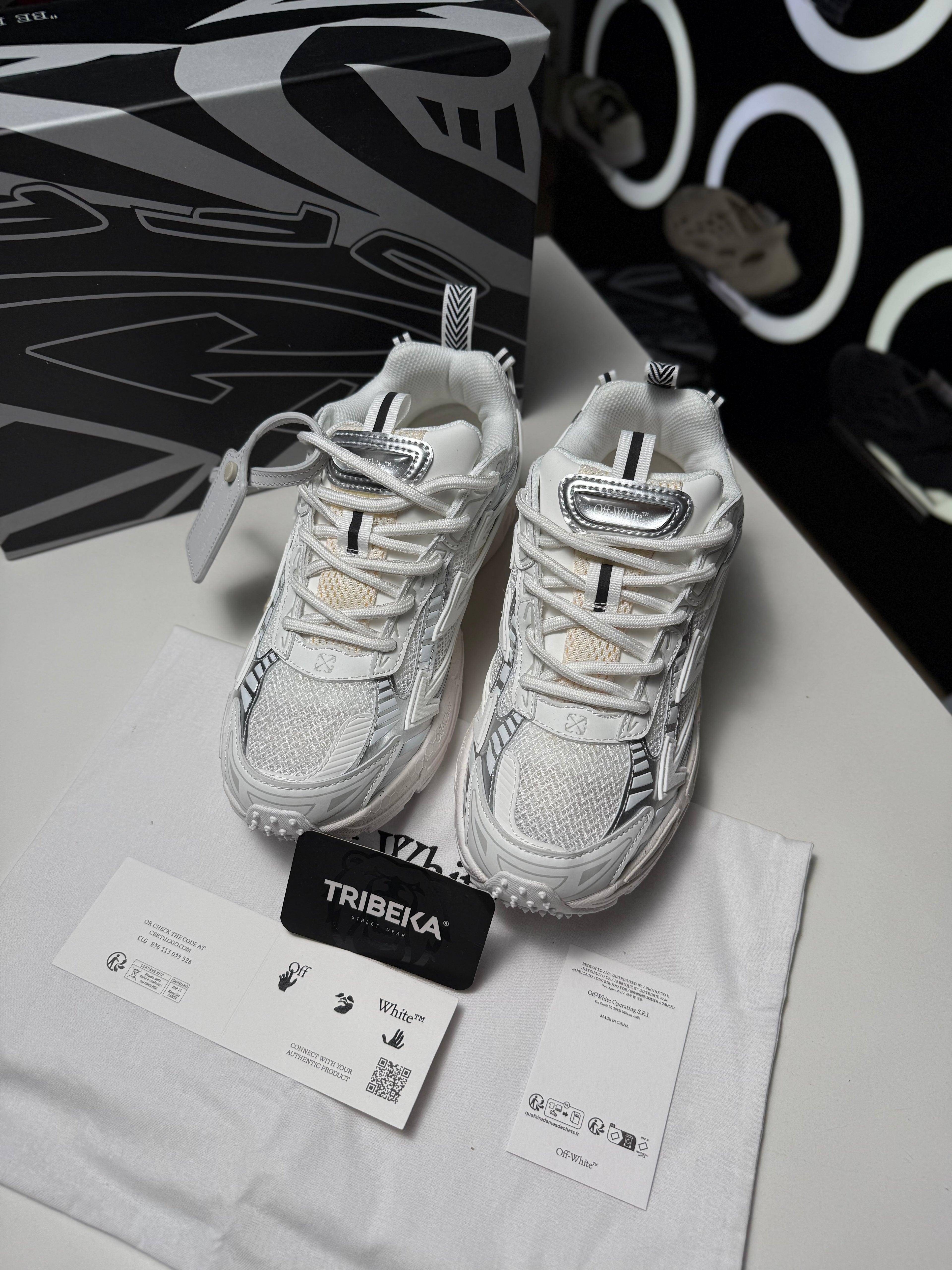 Parte superior de malla, piel sintética y tela con suela de goma. Cordones frente. Logotipo OFF-WHITE engomado en la lengüeta acolchada. Lengüetas dobles. Brida distintiva desmontable en los cordones. Cuello escotado acolchado. Motivos de flechas característicos en los paneles laterales.